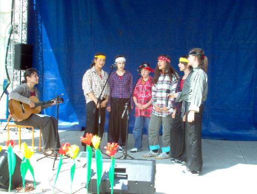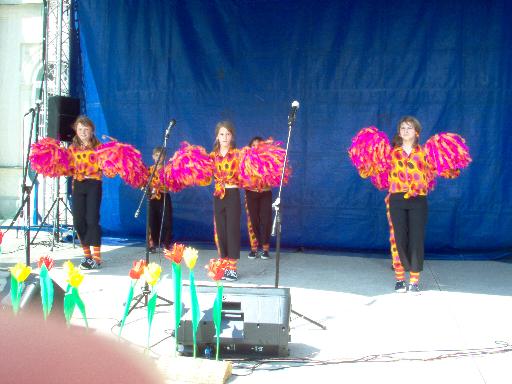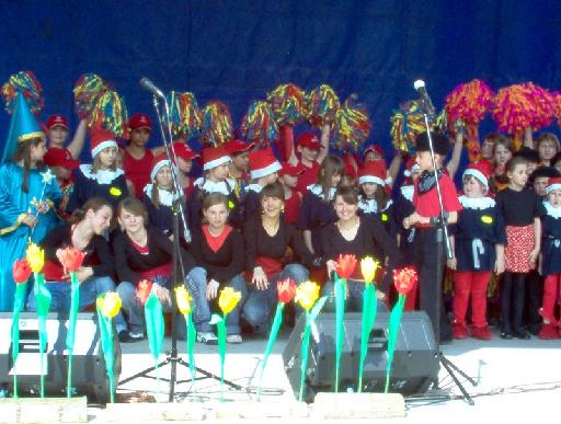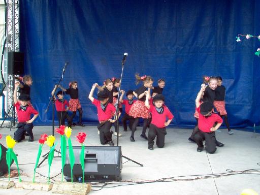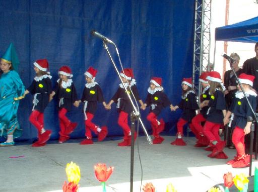 Po uroczystym powitaniu były integracyjne występy na scenie przy fontannach. 49 uczniów naszej szkoły zaprezentowało 20 minutowy barwny program, na który składały się: