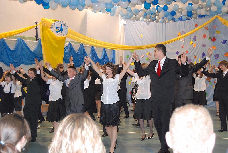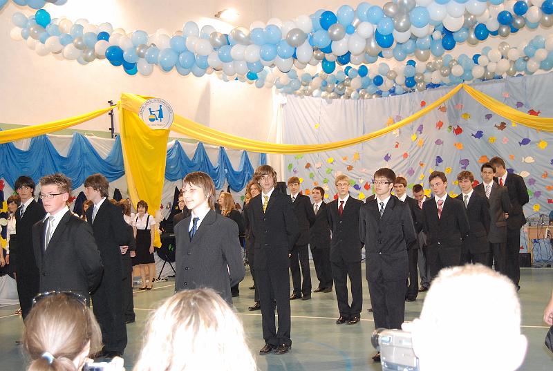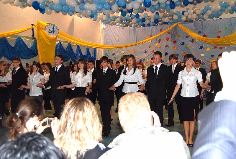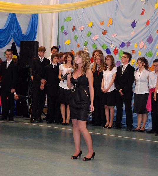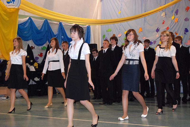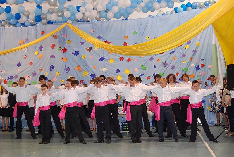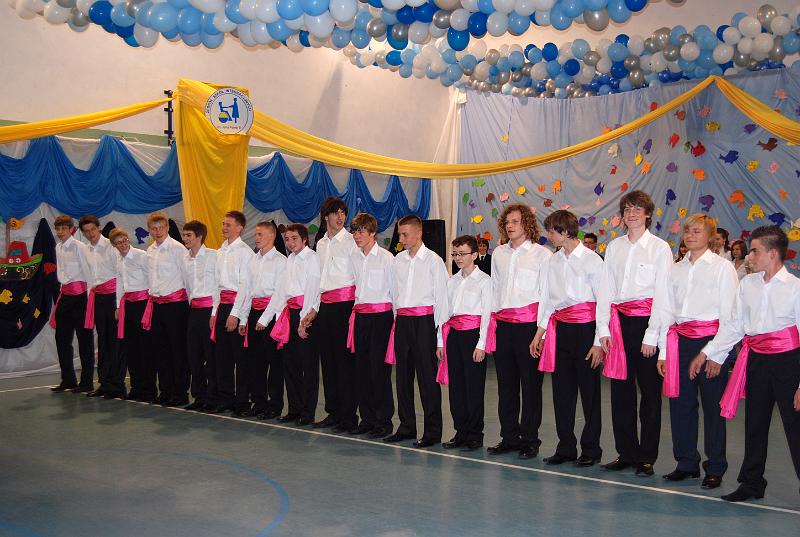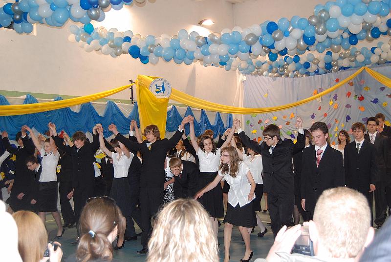 Na uroczystość przybyły wszystkie panie dyrektor, zaproszeni nauczyciele oraz rodzice. Bal rozpoczął się od poloneza w wykonaniu trzecioklasistów. Następnie mogliśmy obejrzeć krótki montaż słowno – muzyczny, który był formą podziękowania uczniów za trud i pracę nauczycieli oraz rodziców. Z wielką przyjemnością wysłuchaliśmy piosenek w wykonaniu Aleksandry Chraboł, Justyny Szewczyk, Aleksandry Wiśniewskiej czy Eryka Najduchowskiego. Swój talent muzyczny zaprezentowali również Mikołaj Marcinkiewicz, Filip Siudziński i Mikołaj Walczak. Jednak największym hitem tej części balu był Grek Zorba – taniec w wykonaniu grupy chłopców. Występy taneczno – muzyczne przeplatały się z dowcipnymi wierszami podsumowującymi trzyletni okres nauki.
