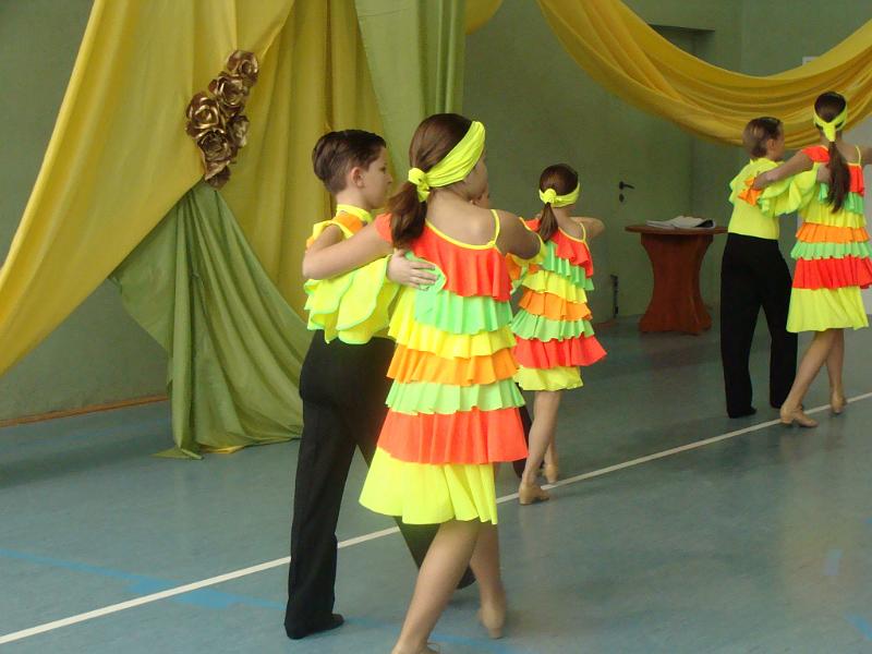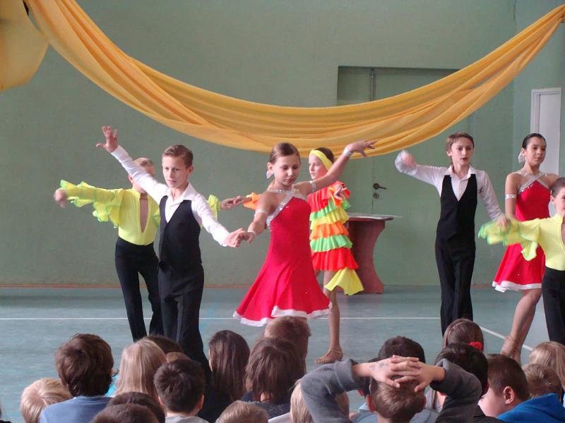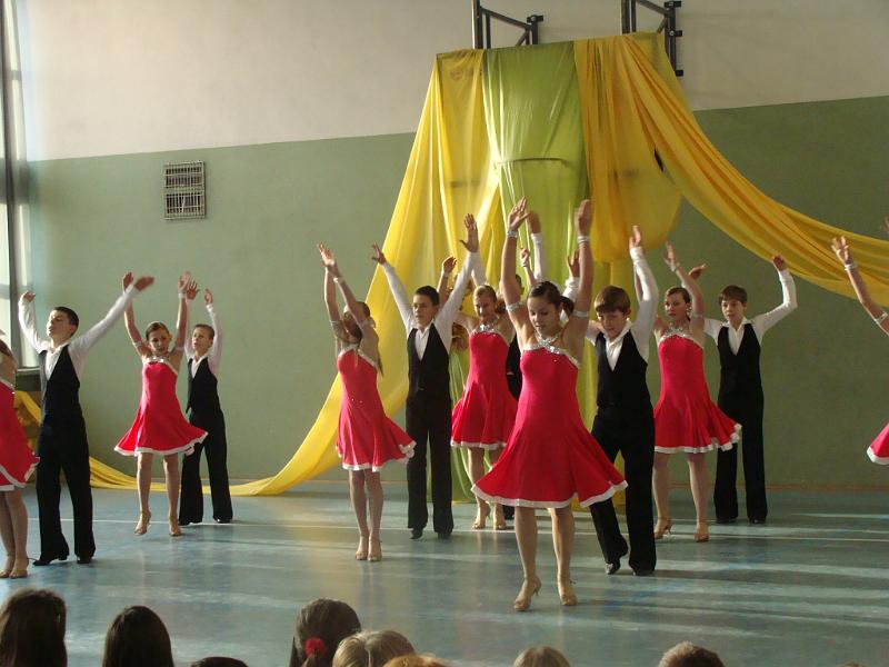 O godzinie 12.00 wszyscy uczniowie zgromadzili się na sali gimnastycznej. Kilka minut później na parkiecie pojawili się tancerze. Urzekły nas barwne stroje oraz umiejętności mistrzów. Przez godzinę z entuzjazmem i zapartym tchem oglądaliśmy występ. Zauroczyły nas wirujące spódniczki oraz gentelmani w białych koszulach. Gorące tańce latynoamerykańskie wywołały falę burzliwych braw. Niesamowita choreografia ułożona pod znane wszystkim piosenki z High School Musical zrobiła na nas wielkie wrażenie. Występ formacji Junior z Akademii Tańca CMG był charytatywny. Cieszymy się, że pieniądze zebrane podczas tego pokazu mogły zasilić konto Michała. Mamy nadzieję, że kwota zebrana na terenie naszej szkoły, choć częściowo pokryje rehabilitację chłopca.