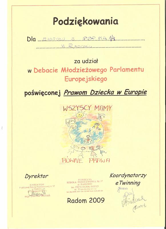 Przedstawiciele starszych klas szkoły podstawowej wzięli udział w Debacie Młodzieżowego Parlamentu Europejskiego poświęconej Prawom Dziecka w Europie. Debata odbyła się w zaprzyjaźnionej PSP nr 17 w Radomiu. Przedstawiciele dziesięciu państw – Wielkiej Brytanii, Francji, Hiszpanii, Szwecji, Czech, Polski, Niemiec, Litwy, Włoch i Węgier – prezentowali informacje dotyczące praw dziecka w „swoim” kraju.