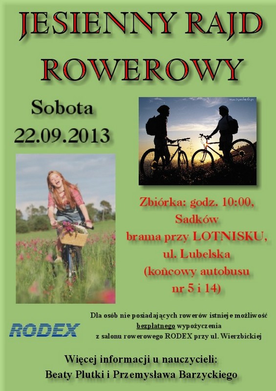 Zapraszamy wszystkich uczniów lubiących aktywny wypoczynek do udziału w rajdzie rowerowym, który odbędzie się 22.09.12r. (sobota). Więcej informacji u nauczycieli wychowania fizycznego: Beaty Plutki i Przemysława Barzyckiego.