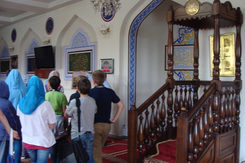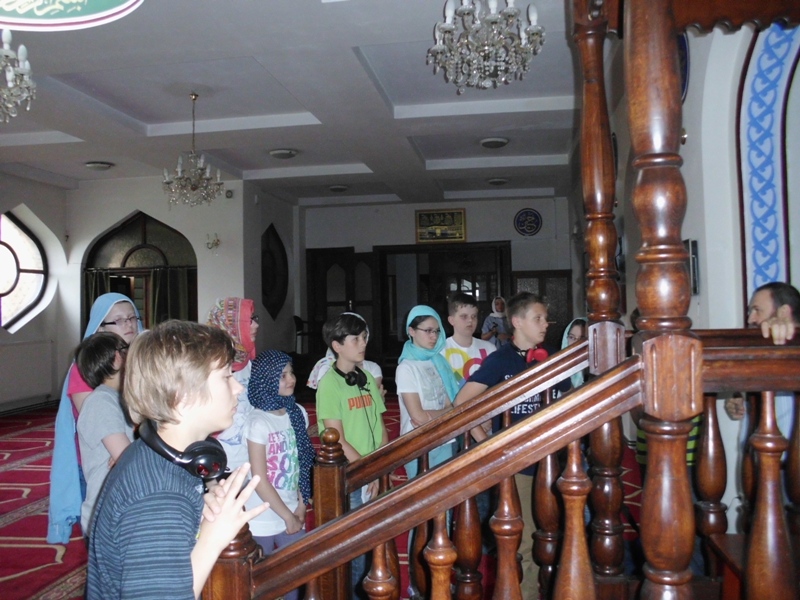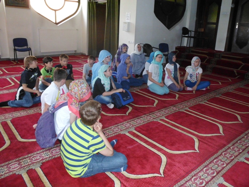 Kolejnym miejscem, które odwiedziliśmy był meczet. Jest to islamska świątynia. Żeby do niej wejść dziewczynki musiały założyć chusty na głowę. Wszyscy też zdjęli buty. Tam dowiedzieliśmy się między innymi, że muzułmanie modlą się 5 razy dziennie w stronę Mekki w dużych salach, gdzie podłogi pokryte są dywanami. Świętą księgą muzułmanów jest Koran. Posługują się dwoma kalendarzami. Pierwszy – taki, który obowiązuje wszystkich ludzi. Drugi to kalendarz księżycowy - patrząc na fazy księżyca ocenia się kiedy jest koniec i początek miesiąca. Ważnymi elementami w meczecie są: kopuła, miejsce na ścianie, wskazujące kierunek modlitwy, wzniesienie, na którym stoi osoba prowadząca modlitwę. Dla muzułmanów najważniejszym prorokiem był Mahomet.
