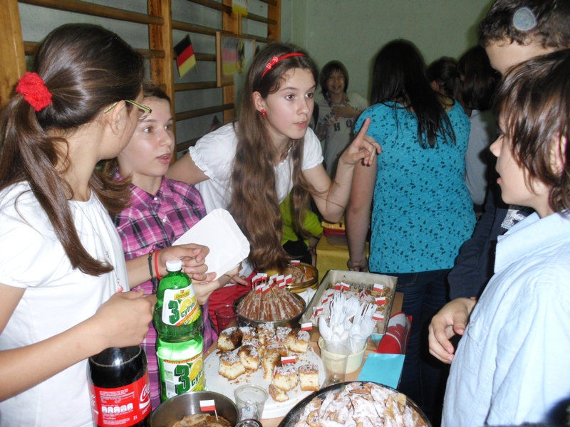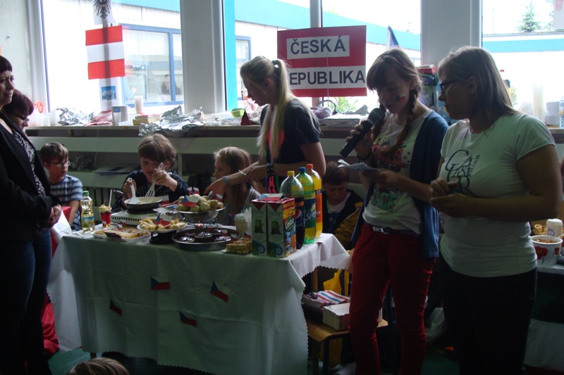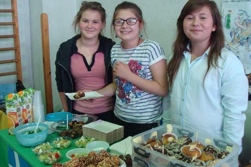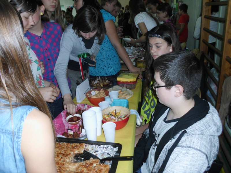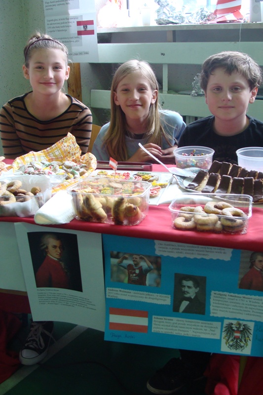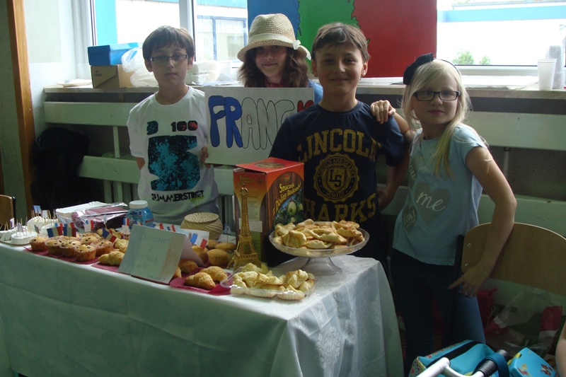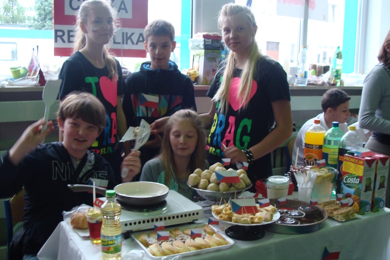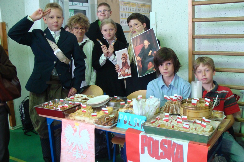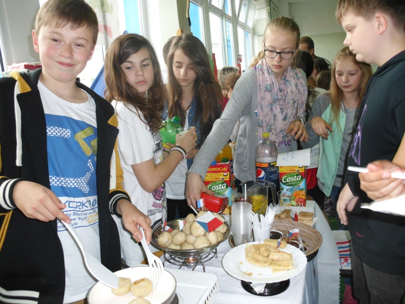 W czwartek 6 czerwca uczniowie klas 4 - 6 wzięli udział w pikniku europejskim zorganizowanym w naszej szkole. Spotkanie było okazją do poszerzenia wiedzy oraz degustacji potraw z krajów europejskich takich jak: Grecja, Węgry, Niemcy, Polska, Włochy, Wielka Brytania, Czechy, Turcja, Francja oraz Austria. Każda klasa przygotowała stoisko z potrawami narodowymi oraz najważniejszymi informacjami dotyczącymi wylosowanego wcześniej państwa. Uczniowie włożyli wiele wysiłku w dekorowanie stoisk, przygotowując między innymi flagi państw oraz rysunki przedstawiające charakterystyczne budowle danego kraju. Jednak najwięcej radości sprawiła wszystkim możliwość skosztowania tradycyjnych potraw, które w większości zostały przygotowane przez dzieci. Za symboliczną złotówkę można było skosztować np. pizzę prosto z Włoch, leczo z Węgier, tosty z Wielkiej Brytanii lub rodzimy sernik i mazurek. Zarobione w ten sposób fundusze zostaną przeznaczone na wspólne świętowanie zakończenia roku szkolnego.