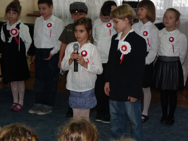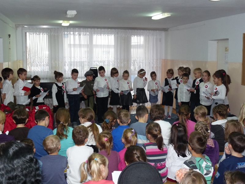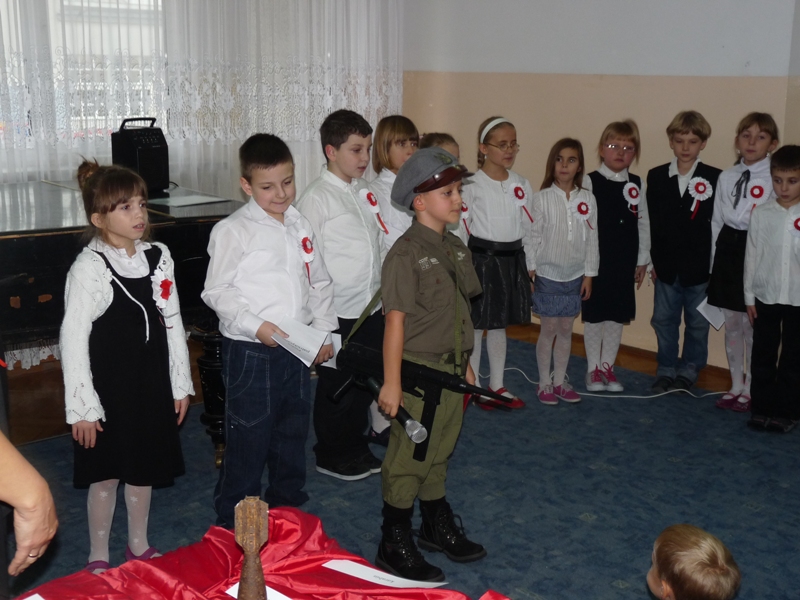 Lekcję patriotyzmu dla najmłodszych, w dniu 12 listopada 2012r., przygotowali uczniowie klasy 2a wraz ze swoimi nauczycielkami. Na program złożyła się wystawa eksponatów pochodzących z I wojny światowej oraz montaż słowno-muzyczny. Krótkie informacje o tym święcie i śpiewane wspólnie z publicznością pieśni patriotyczne (ze specjalnie przygotowanych na tę uroczystość śpiewników), przybliżyły najmłodszym obraz tamtych dni. Galowe stroje i kotyliony podkreśliły uroczysty charakter tego spotkania. Zgromadzeni nauczyciele, rodzice, dziadkowie i uczniowie oklaskami podziękowali za wzruszające chwile, które stały się ich udziałem. Patriotyzmu uczymy się przecież od najmłodszych lat.